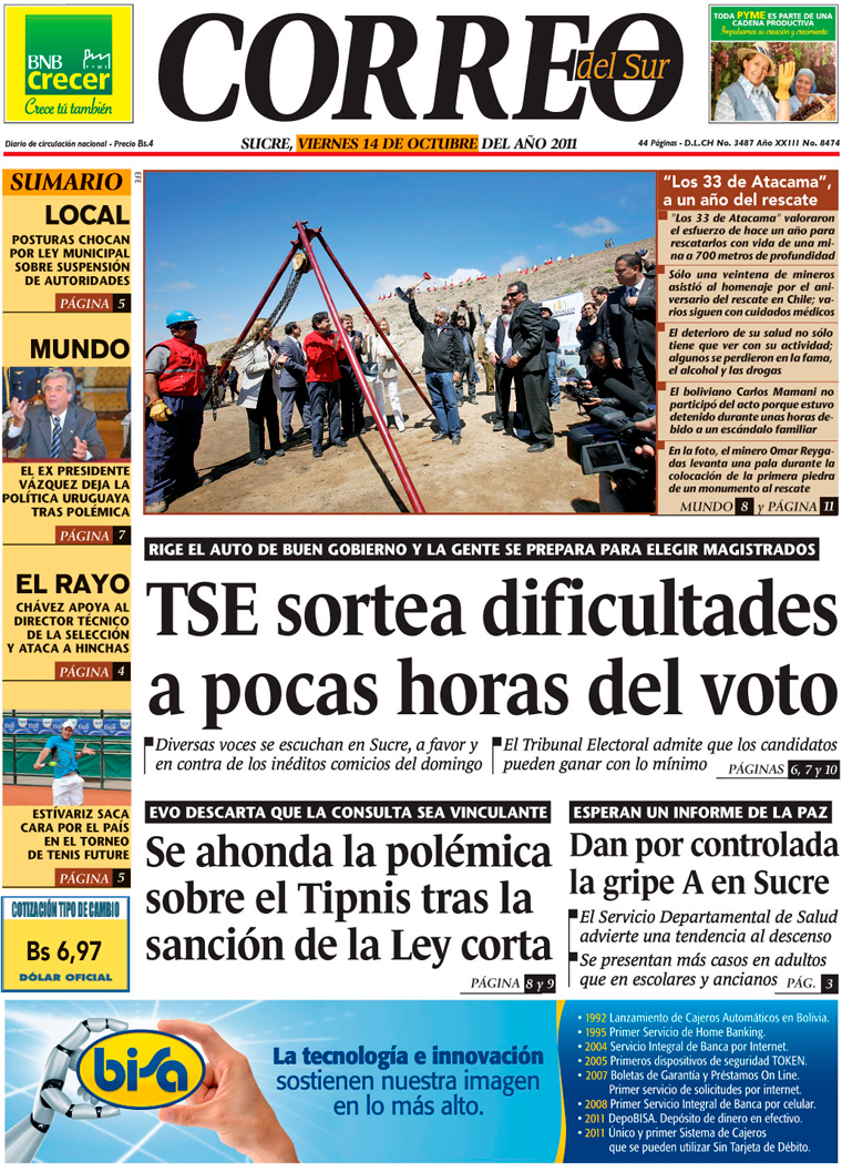 El Tribunal Electoral Departamental (TED) aseguró tener todo listo para las elecciones de este domingo. No habrá inauguración de la mesa 1 como se hacía antes; el acto inaugural consistirá en una conferencia de prensa en instalaciones del ente electoral; las mesas se abrirán de 8:00 a 16:00, y el cómputo oficial comenzará a las 18:00 en instalaciones de la entidad electoral. Corre el Auto de Buen Gobierno y se anuncian sanciones entre Bs 100 y 600 para los ciudadanos infractores...