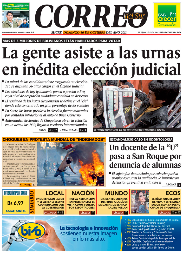 Dos discursos se contraponen en este peculiar día de elecciones. El primero: Pioneros –como en tantas cosas– los bolivianos seremos el primer país del hemisferio que irá a las urnas para elegir a la totalidad de su Poder Judicial. No contentos con votar por los miembros del Tribunal Supremo Electoral y el Tribunal Constitucional Plurinacional, votaremos por el ¡Tribunal Agro Ambiental y el Consejo de la Magistratura! ¿Se puede pedir más democracia? El celofán que envuelve el proceso, es evidente, lo puede todo; por ejemplo esta celebración por adelantado de la democracia participativa de los bolivianos...