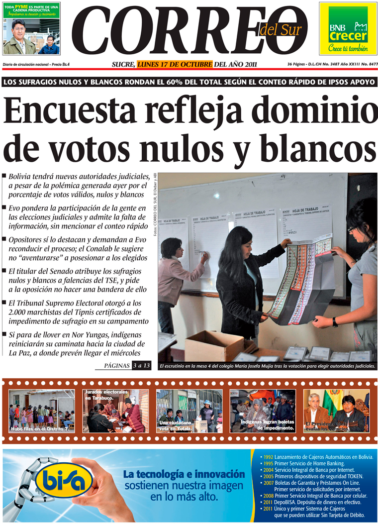 Los votos nulos y blancos alentados por la oposición aparecieron y se impusieron con más del 60% en las elecciones judiciales que se celebraron ayer en todo el país, según resultados no oficiales de conteo rápido difundidos por la red de televisión ATB. Con ese estigma, calificado como una derrota para el Gobierno, nace la nueva justicia en el Órgano Judicial y el Tribunal Constitucional Plurinacional...