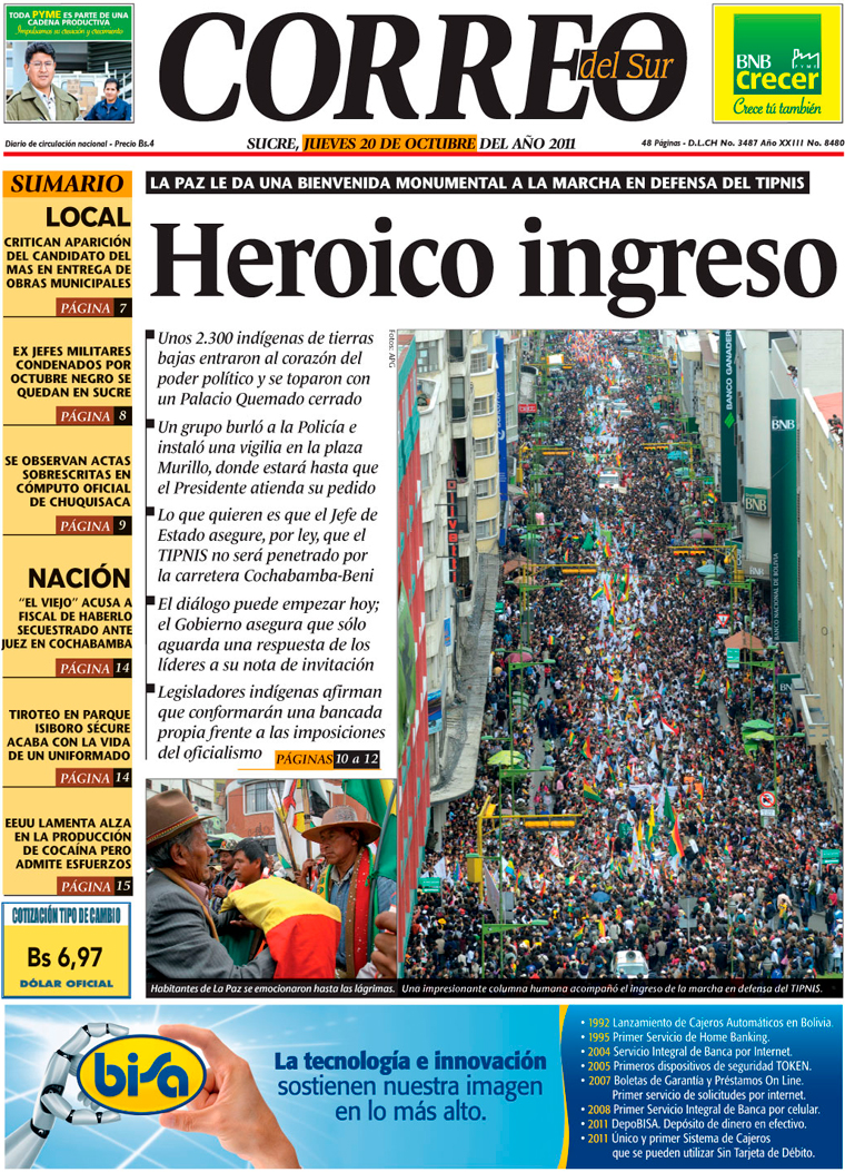 En Sucre, también hubo movilización en apoyo a los marchistas del TIPNIS. La más notoria, la marcha de “solidaridad” con los marchistas del TIPNIS de la Universidad San Francisco Xavier de Chuquisaca. Ni bien vieron en la televisión el gran recibimiento del que fueron objeto los marchistas del TIPNIS en La Paz, los tres estamentos de San Francisco Xavier –docentes, universitarios y administrativos– convocaron a una marcha de “solidaridad” con los marchistas del TIPNIS, la misma que se materializó en horas de la tarde y recorrió las principales arterias de la Capital, con estribillos que decían “Si Evo quiere coca, que siempre en Orinoca”, para expresar su apoyo a la defensa del TIPNIS...