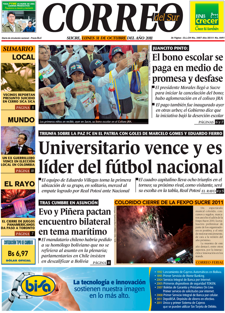 En la ceremonia inaugural del pago del Bono Juancito Pinto, el presidente Evo Morales se comprometió a trabajar para extender el pago del beneficio hasta sexto de secundaria, y aprovechó la ocasión para anunciar que su Gobierno dotará de paneles solares a todas las escuelas rurales de país con carestía de energía eléctrica. Y, de paso, habló de la posibilidad de crear cuentas bancarias para niños, con el fin de incentivar la cultura del ahorro en ellos. No todo fue alegría y buenas noticias, sin embargo. Muchos niños se extraviaron temporalmente en el Coliseo JRA de la Capital, el lugar escogido para la ceremonia inaugural, debido a que no dejaron ingresar a sus padres al recinto...