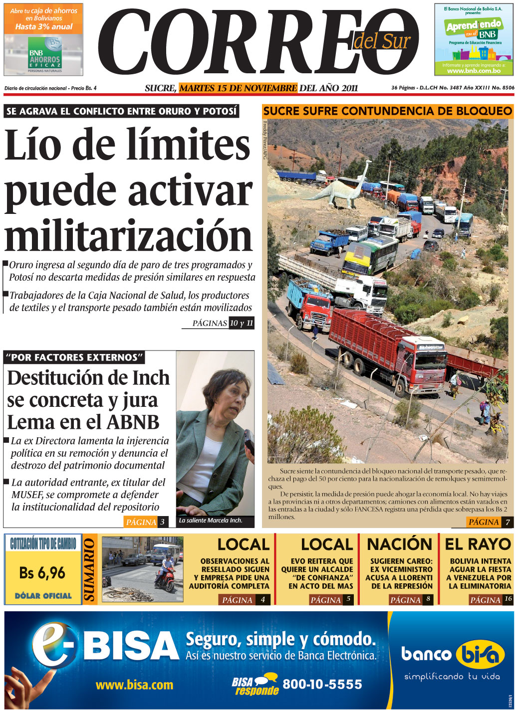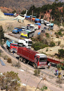 Las cuatro vías de comunicación de Sucre están bloqueadas por el transporte pesado. Ayer, centenares de tráilers y equipo pesado bloquearon los cuatro ingresos a la ciudad dejando a flotas y camiones varados con diferentes productos. La Fábrica Nacional de Cemento S.A (FANCESA) no pudo enviar su producto al país y tampoco atender la demanda local, registrando una pérdida de más de 2 millones de bolivianos, y las empresas de transporte interdepartamental suspendieron viajes...