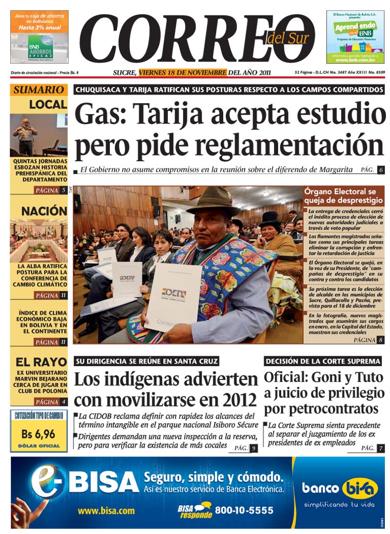 Sucre, Quillacollo y Pazña, prevista para el 18 de diciembre