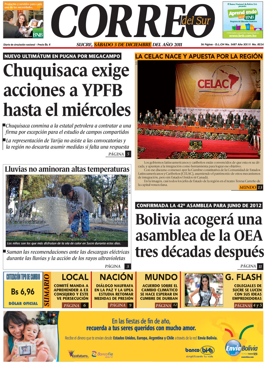 Tarija cumplió su amenaza: no asistió a la reunión convocada por YPFB. Sólo la delegación chuquisaqueña se hizo presente en la ciudad de La Paz. Y, al final, tras el encuentro que sostuvieron con el presidente de YPFB, Carlos Villegas, las autoridades chuquisaqueñas decidieron ponerle plazo a su paciencia, y le exigieron a Villegas que responda a la demanda de Chuquisaca hasta el 7 de diciembre. Si no hay respuesta positiva hasta esa fecha, la región se reservará el derecho de asumir las medidas que considere convenientes...