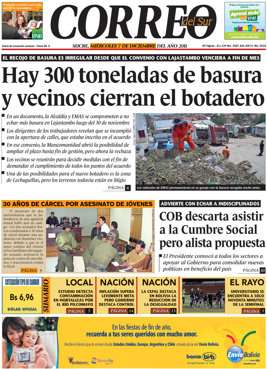 Sucre tiene acumuladas unas 300 toneladas de basura y la Empresa Municipal de Aseo Sucre (EMAS) no sabe qué hacer con ellas, tras el cumplimiento del plazo para el cierre del botadero “La Esperanza” y ante el rechazo de los vecinos de Lajastambo a una posible ampliación...